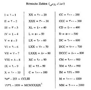 در كتاب «تابلِن بوخ» آلماني شرح اعداد رومي را به طريق زير مينويسد:
